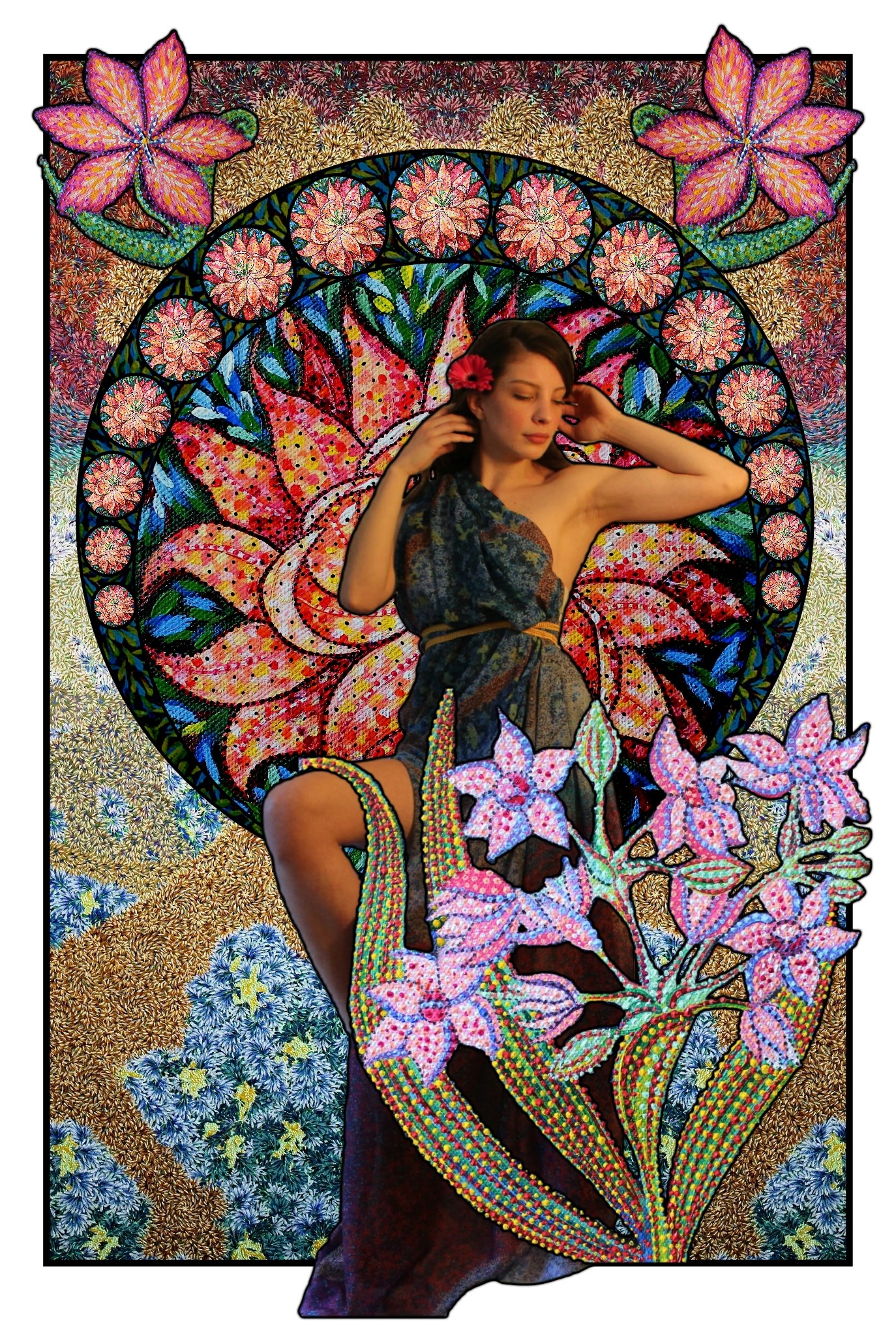 The abstract features of the paintings and graphics on display, and the textile designs used in DORA’s collection of bespoke attire that is based on the paintings, are inspired by the fundamental algorithms that describe the formation of crystals and organic chemical structures. Their more easily recognizable figurative elements focus on natural settings bursting with symbols of love, fertility and acceptance, with thematic references to Sumerian, Greek and Etruscan mythology.